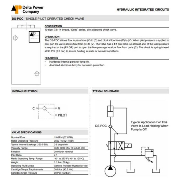 DS-POC-V-S DELTA POWER, SINGLE PILOT OPERATED CHECK VALVE, DELTA SERIES, 10 SIZE, 7/8-14 THREAD, W/ VITON SEALS, #8 SAE PORTS, DS POC V S, DSPOCVS