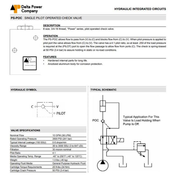 PS-POC-B-N DELTA POWER, SINGLE PILOT OPERATED CHECK VALVE, POWER SERIES, 8 SIZE, 3/4-16 THREAD, W/ BUNA SEALS, 1/4 NPTF PORTS, PS POC B N, PSPOCBN
