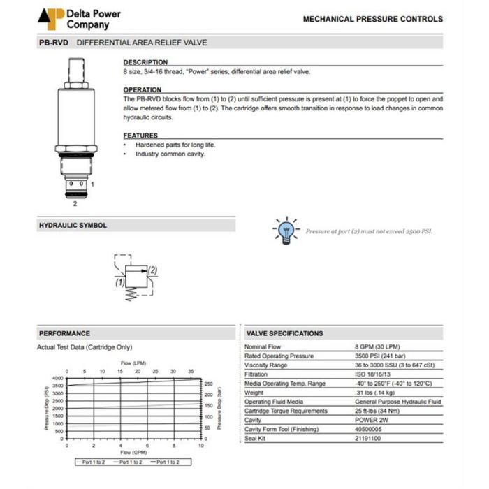 PB-RVD-0K-3500 DELTA POWER, RELIEF VALVE - DIFFERENTIAL AREA, 8 SIZE, 3/4-16 THREAD, POWER SERIES, W/ BUNA SEALS & OVERRIDE KNOB, 2000-3500 PSI PRESSURE RANGE, PB RVD 0K 3500, PBRVD0K3500