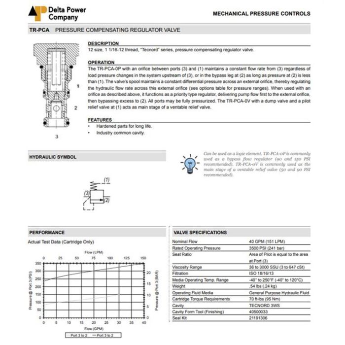 TR-PCA-0P-0090 DELTA POWER, HYDRAULIC VALVE, CARTRIDGE FLOW CONTROL PRESSURE COMPENSATED, 1 1/16"-12 UNF THREAD, TECNORD SERIES, PRESSURE COMPENSATING VALVE, RESTRICTIVE TYPE. UP TO 40.0 GPM, SETTING: 3500 PSI, PRESSURE SETTING 90 PSI, BUNA STANDARD. TR-PCA-0P-0090