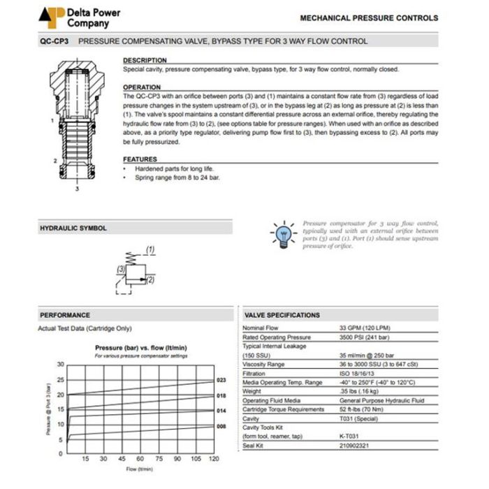 QC-CP3-00-0014 DELTA POWER, PRESSURE COMPENSATED REGULATOR - BYPASS, SPECIAL CAVITY, PRESSURE COMPENSATING VALVE, W/ BUNA SEALS, 200 PSI @ 60 L/MIN, QC CP3 00 0014, QCCP3000014