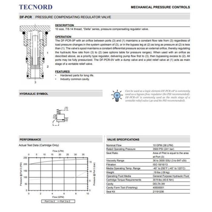 DF-PCR-VP-0040 DELTA POWER, PRESSURE COMPENSATED REGULATOR - BYPASS, 10 SIZE, 7/8-14 THREAD, DELTA SERIES, W/ VITON SEALS, PILOT TO CLOSE, 40 PSI PRESSURE SETTING, DF PCR VP 0040, DFPCRVP0040