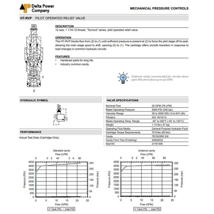 HT-RVP-VK-5000 DELTA POWER, RELIEF VALVE - PILOT OPERATED, 12 SIZE, 1 1/16-12 THREAD, TECNORD SERIES, W/ VITON SEALS & OVERRIDE KNOB, 1000-5000 PSI PRESSURE RANGE, HT RVP VK 5000, HTRVPVK5000