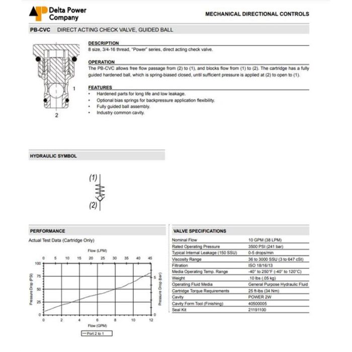 PB-CVC-V0-0005 DELTA POWER, CHECK VALVE - GUIDED BALL, 8 SIZE, 3/4-16 THREAD, POWER SERIES, W/ VITON SEALS, 5 PSI CRACK PRESSURE, PB CVC V0 0005, PBCVCV00005