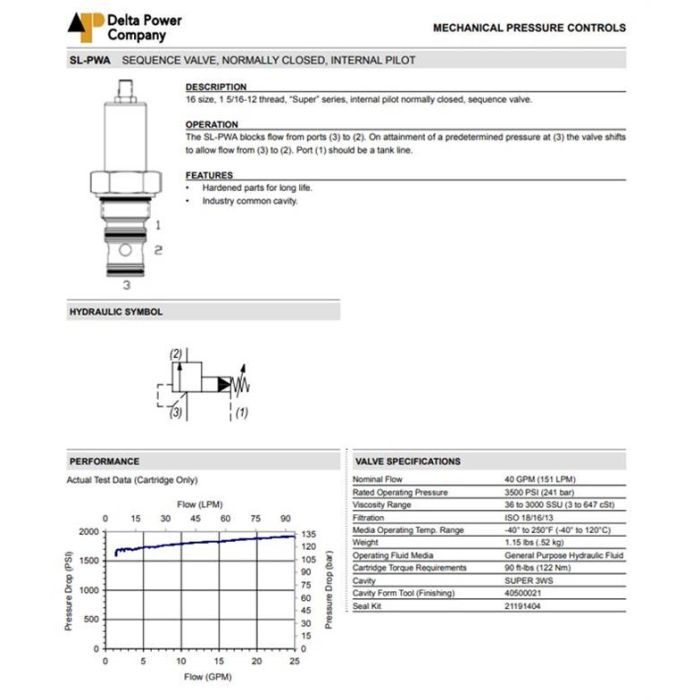 SL-PWA-0K-3000 DELTA POWER, SEQUENCE VALVE - 2 WAY NORMALLY CLOSED - EXTERNAL PILOT, 16 SIZE, 1 5/16-12 THREAD, SUPER SERIES, W/ BUNA SEALS & OVERRODE KNOB, 500-3000 PSI PRESSURE RANGE, SL PWA 0K 3000, SLPWA0K3000