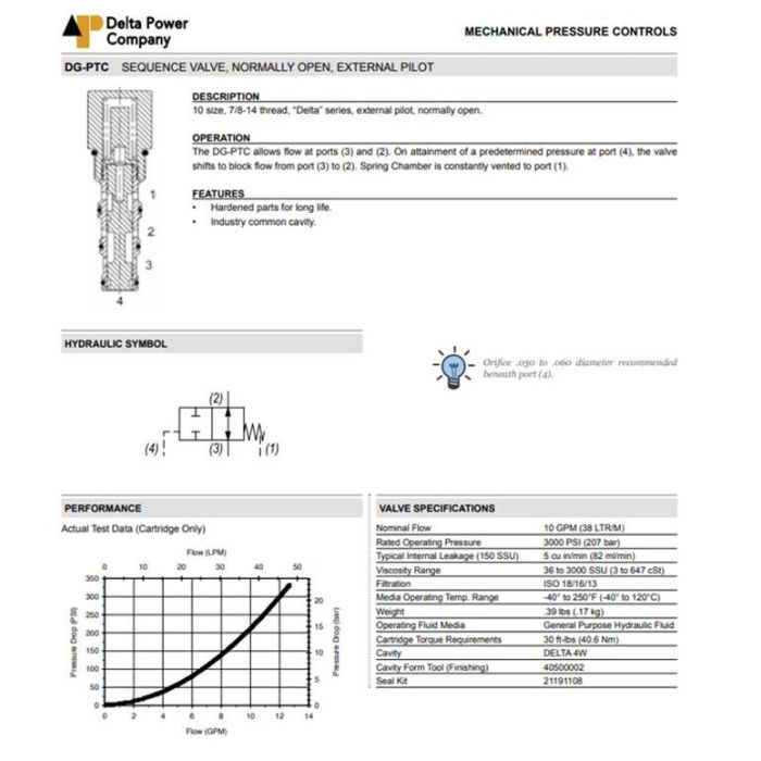 DG-PTC-00-0180 DELTA POWER, SEQUENCE VALVE - 2 WAY NORMALLY CLOSED - EXTERNAL PILOT & DRAIN, 10 SIZE, 7/8-14 THREAD, DELTA SERIES, W/ BUNA SEALS, 180 PSI SPRING BIAS, DG PTC 00 0180, DGPTC000180