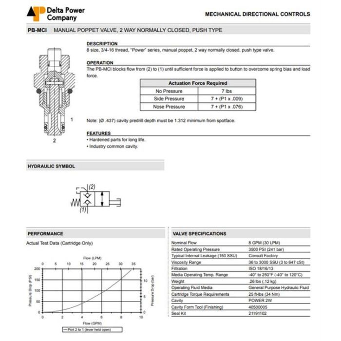PB-MCI-00 DELTA POWER, MANUAL OPERATED 2W2P NORMALLY CLOSED - BIDIRECTIONAL, 8 SIZE, 3/4-16 THREAD, POWER SERIES, W/ BUNA SEALS, PB MCI 00, PBMCI00