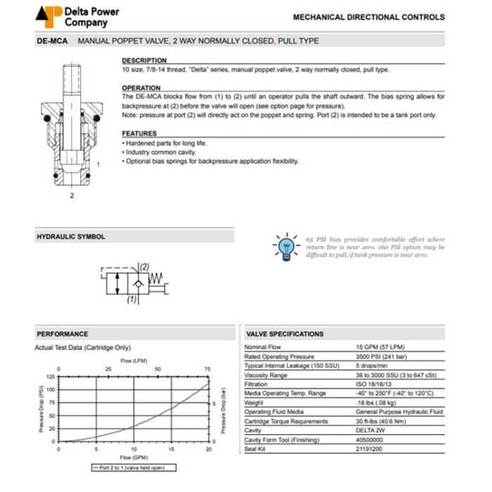 DE-MCA-W0-0160 DELTA POWER, MANUAL OPERATED 2W2P NORMALLY CLOSED - PULL TYPE, 10 SIZE, 7/8-14 THREAD, DELTA SERIES, W/ VITON SEALS & SCREEN, 160 PSI SPRING BIAS PRESSURE, DE MCA W0 0160, DEMCAW00160