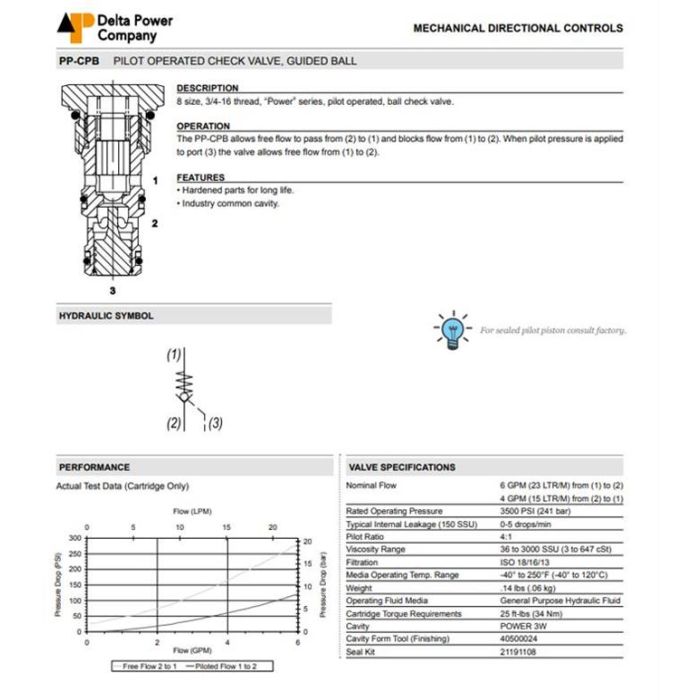 PP-CPB-00-0025 DELTA POWER, CHECK VALVE - PILOT TO OPEN, 8 SIZE, 3/4-16 THREAD, POWER SERIES, W/ BUNA SEALS, 25 PSI CRACK PRESSURE, PP CPB 00 0025, PPCPB000025
