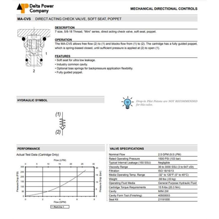 MA-CVS-V0-0020 DELTA POWER, CHECK VALVE - SOFT SEAT - POPPET, 7 SIZE, 5/8-18 THREAD, MINI SERIES, W/ VITON SEALS, 20 PSI CRACK PRESSURE, MA CVS V0 0020, MACVSV00020