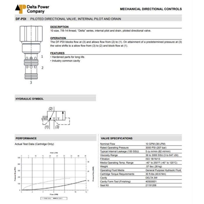 DF-PDI-00-0050 DELTA POWER, PILOT TO SHIFT 3W INTERNAL PILOT & DRAIN, 10 SIZE, 7/8-14 THREAD, DELTA SERIES, W/ BUNA SEALS, 50 PSI PRESSURE SETTINGS, DF PDI 00 0050, DFPDI000050