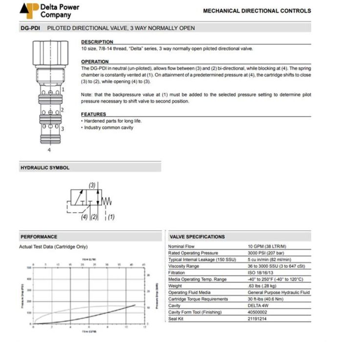 DG-PDI-00-0080 DELTA POWER, PILOT TO SHIFT 3W INTERNAL PILOT & EXTERNAL DRAIN, 10 SIZE, 7/8-14 THREAD, DELTA SERIES, W/ BUNA SEALS, 80 PSI PRESSURE SETTINGS, DG PDI 00 0080, DGPDI000080