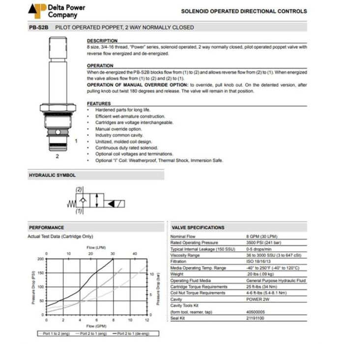 PB-S2B-B4 DELTA POWER, 2W2P NORMALLY CLOSED PILOT OPERATED POPPET - REVERSE FLOW ENERGIZED, POWER SERIES 8 SIZE, 3/4-16 THREAD, W/ BUNA SEALS, SCREEN, OVERRIDE & DETENT, PB S2B B4, PBS2BB4
