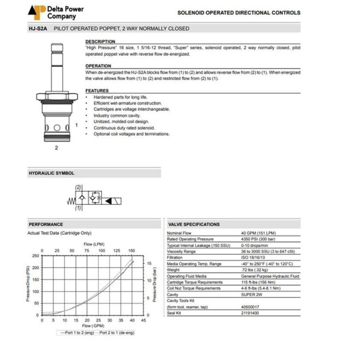 HJ-S2A-00 DELTA POWER, 2W2P NORMALLY CLOSED PILOT OPERATED POPPET, HIGH PRESSURE SUPER SERIES 16 SIZE, 1 5/16-12 THREAD, W/ BUNA SEALS, HJ S2A 00, HJS2A00
