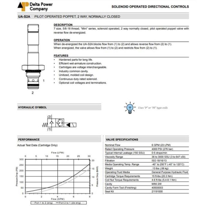 UA-S2A-V0 DELTA POWER, 2W2P NORMALLY CLOSED PILOT OPERATED POPPET, MINI SERIES 7 SIZE, 5/8-18 THREAD, W/ VITON SEALS, UA S2A V0, UAS2AV0