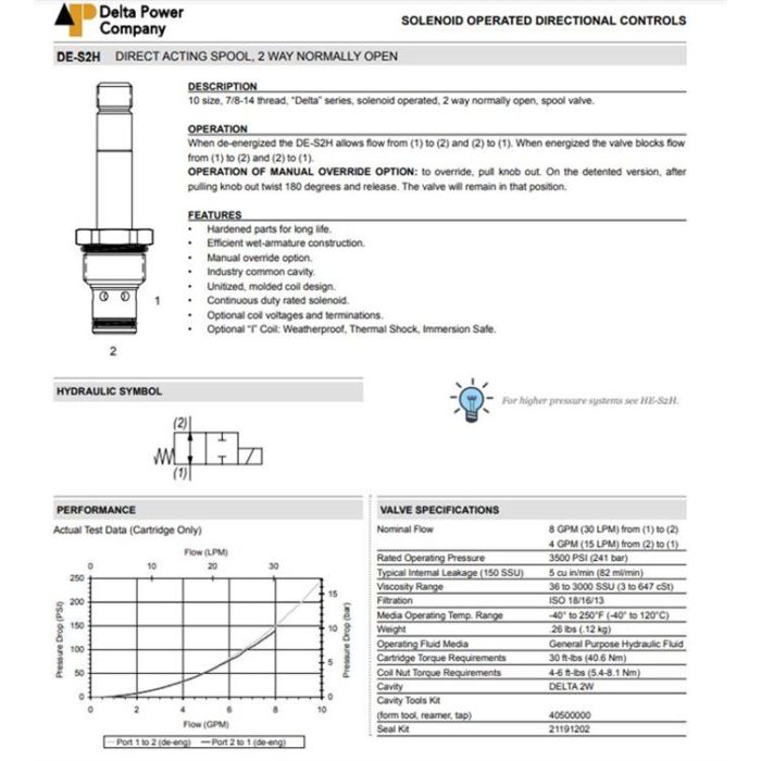 DE-S2H-B3 DELTA POWER, 2W2P NORMALLY OPEN SPOOL, DELTA SERIES 10 SIZE, 7/8-14 THREAD, W/ BUNA SEALS, SCREEN, OVERRIDE & NON-DETENT, DE S2H B3, DES2HB3