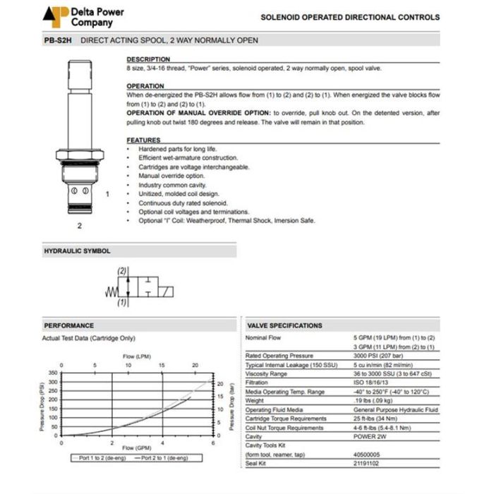PB-S2H-B1 DELTA POWER, 2W2P NORMALLY OPEN SPOOL, POWER SERIES 8 SIZE, 3/4-16 THREAD, W/ BUNA SEALS, OVERRIDE & NON-DETENT, PB S2H B1, PBS2HB1