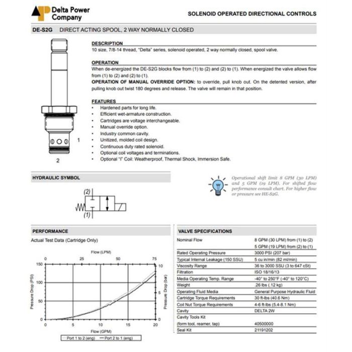 DE-S2G-VM DELTA POWER, 2W2P NORMALLY CLOSED SPOOL, DELTA SERIES 10 SIZE, 7/8-14 THREAD, W/ VITON SEALS, OVERRIDE & DETENT, DE S2G VM, DES2GVM