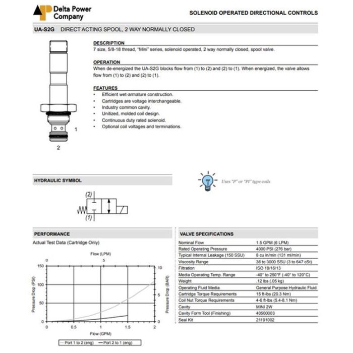 UA-S2G-00 DELTA POWER, 2W2P NORMALLY CLOSED SPOOL, MINI SERIES 7 SIZE, 5/8-18 THREAD, W/ BUNA SEALS, UA S2G 00, UAS2G00