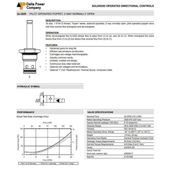 SJ-S2D-VK DELTA POWER, 2W2P NORMALLY OPEN PILOT OPERATED POPPET - REVERSE FLOW DE-ENERGIZED, SUPER SERIES 16 SIZE, 1 5/16-12 THREAD, W/ VITON SEALS & OVERRIDE, SJ S2D VK, SJS2DVK