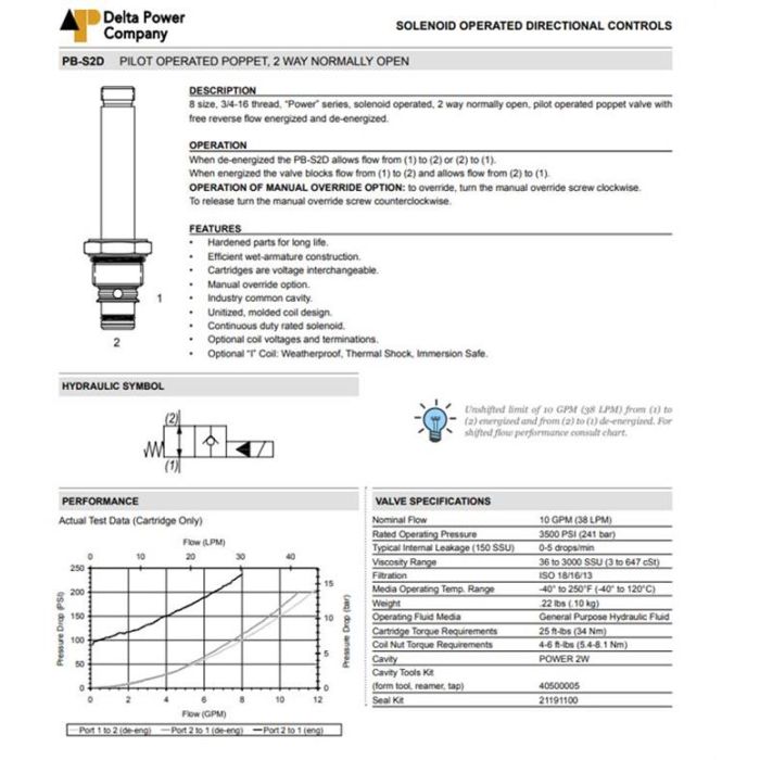 PB-S2D-B5 DELTA POWER, 2W2P NORMALLY OPEN PILOT OPERATED POPPET - REVERSE FLOW DE-ENERGIZED, POWER SERIES 8 SIZE, 3/4-16 THREAD, W/ BUNA SEALS, SCREEN, & OVERRIDE KNOB, PB S2D B5, PBS2DB5