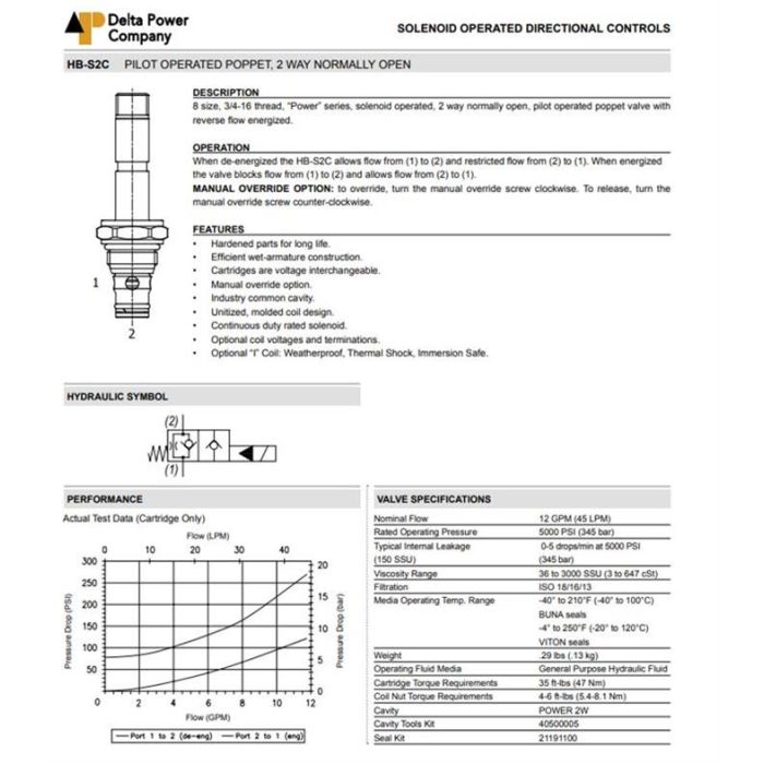 HB-S2C-0K DELTA POWER, 2W2P NORMALLY OPEN PILOT OPERATED POPPET, HIGH PRESSURE POWER SERIES 8 SIZE, 3/4-16 THREAD, W/ BUNA SEALS, OVERRIDE SCREW TYPE KNOB, HB S2C 0K, HBS2C0K