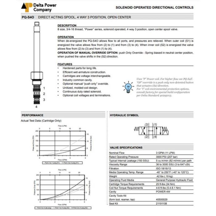 PQ-S4O-VP DELTA POWER, 4W3P SPOOL OPEN CENTER, POWER SERIES 8 SIZE, 3/4-16 THREAD, W/ VITON SEALS & PUSH ONLY OVERRIDE, PQ S4O VP, PQS4OVP