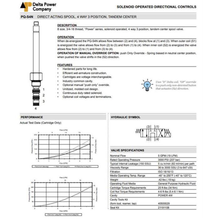 PQ-S4N-00 DELTA POWER, HYDRAULIC VALVE, CARTRIDGE DIRECTION CONTROL FOUR WAY, 3/4"-16 UNF THREAD, POWER SERIES, 4 WAY, THREE POSITION TANDEM CENTER SPOOL VALVE WITH DELTA COIL, UP TO 3.0 GPM, 3000 PSI, BUNA STANDARD PQ-S4N-OO