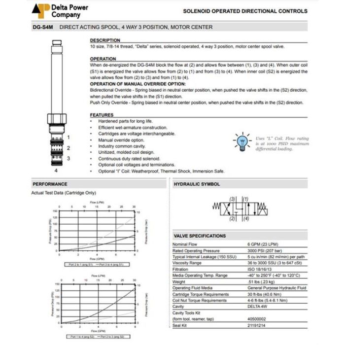 DG-S4M-0M DELTA POWER, 4W3P SPOOL MOTOR CENTER, DELTA SERIES 10 SIZE, 7/8-14 THREAD, W/ BUNA SEALS, OVERRIDE & DETENT, DG S4M 0M, DGS4M0M