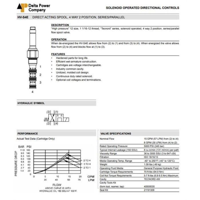 HV-S4E-V0 DELTA POWER, 4W2P SPOOL SERIES/PARALLEL, HIGH PRESSURE TECNORD SERIES 12 SIZE, 1 1/16-12 THREAD, W/ VITON SEALS, HV S4E V0, HVS4EV0