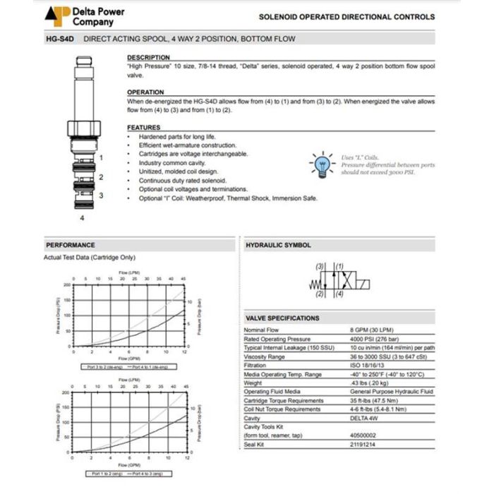 HG-S4D-V0 DELTA POWER, 4W2P SPOOL CRISS-CROSSED (REVERSED), HIGH PRESSURE DELTA SERIES 10 SIZE, 7/8-14 THREAD, W/ VITON SEALS, HG S4D V0, HGS4DV0