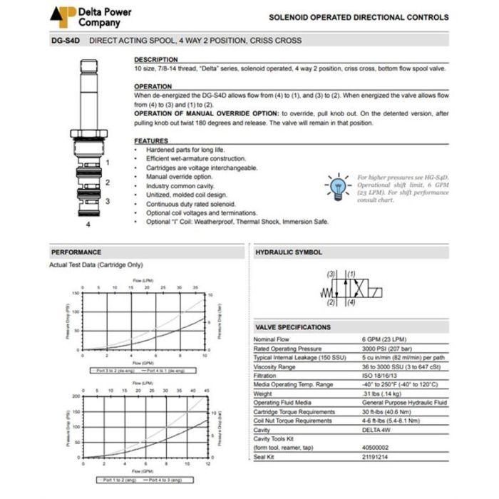 DG-S4D-0M DELTA POWER, 4W2P SPOOL CRISS-CROSSED (REVERSED), DELTA SERIES 10 SIZE, 7/8-14 THREAD, W/ BUNA SEALS, OVERRIDE & DETENT, DG S4D 0M, DGS4D0M