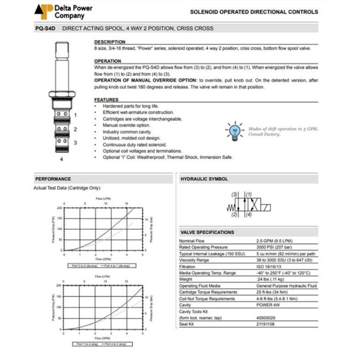 PQ-S4D-0M DELTA POWER, 4W2P SPOOL CRISS-CROSSED (REVERSED), POWER SERIES 8 SIZE, 3/4-16 THREAD, W/ BUNA SEALS, OVERRIDE & DETENT, PQ S4D 0M, PQS4D0M