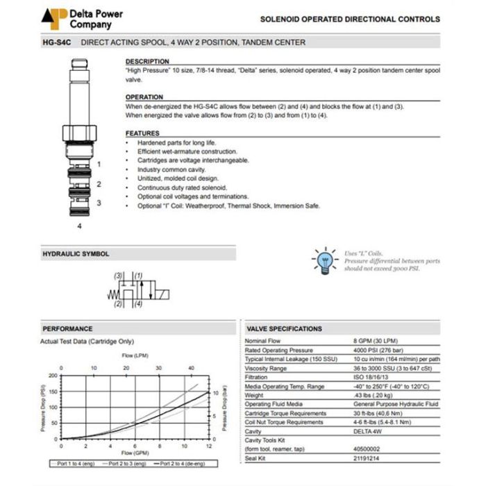 HG-S4C-V0 DELTA POWER, 4W2P SPOOL TANDEM CENTER, HIGH POWER DELTA SERIES 10 SIZE, 7/8-14 THREAD, W/ VITON SEALS, HG S4C V0, HGS4CV0