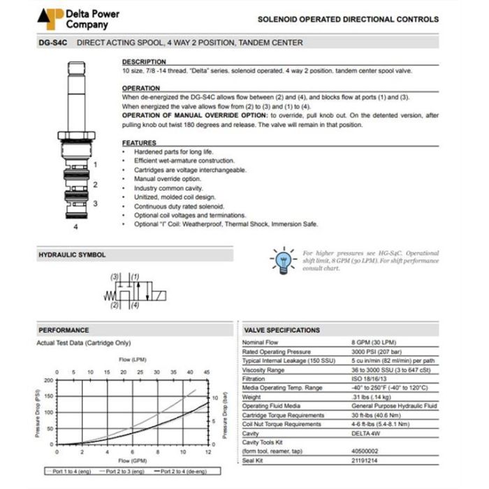 DG-S4C-0M DELTA POWER, 4W2P SPOOL TANDEM CENTER, DELTA SERIES 10 SIZE, 7/8-14 THREAD, W/ BUNA SEALS, OVERRIDE & DETENT, DG S4C 0M, DGS4C0M