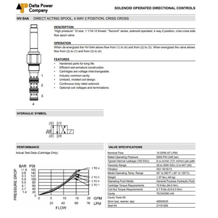 HV-S4A-V0 DELTA POWER, 4W2P SPOOL CRISS-CROSS, HIGH PRESSURE TECNORD SERIES 12 SIZE, 1 1/16-12 THREAD, W/ VITON SEALS, HV S4A V0, HVS4AV0
