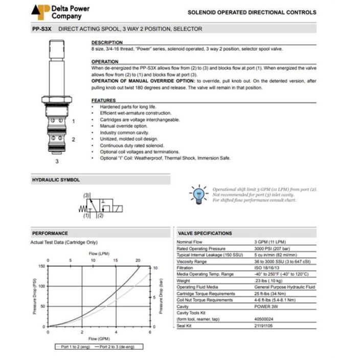 PP-S3X-B1 DELTA POWER, 3W2P SPOOL SELECTOR 2->3 - 2->1, POWER SERIES 8 SIZE, 3/4-16 THREAD, W/ BUNA SEALS, OVERRIDE & NON-DETENT, PP S3X B1, PPS3XB1