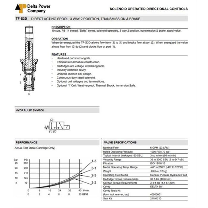 TF-S3D-00 DELTA POWER, TRANSMISSION & BRAKE SPOOL 3W2P SCREW-IN STYLE, DELTA SERIES 10 SIZE, 7/8-14 THREAD, W/ BUNA SEALS, TF S3D 00, TFS3D00