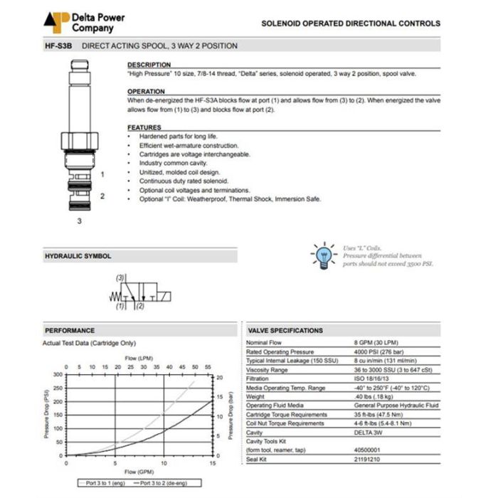 HF-S3B-00 DELTA POWER, 3W2P SPOOL SELECTOR 3->2 - 3->1, HIGH PRESSURE DELTA SERIES 10 SIZE, 7/8-14 THREAD, W/ BUNA SEALS, HF S3B 00, HFS3B00