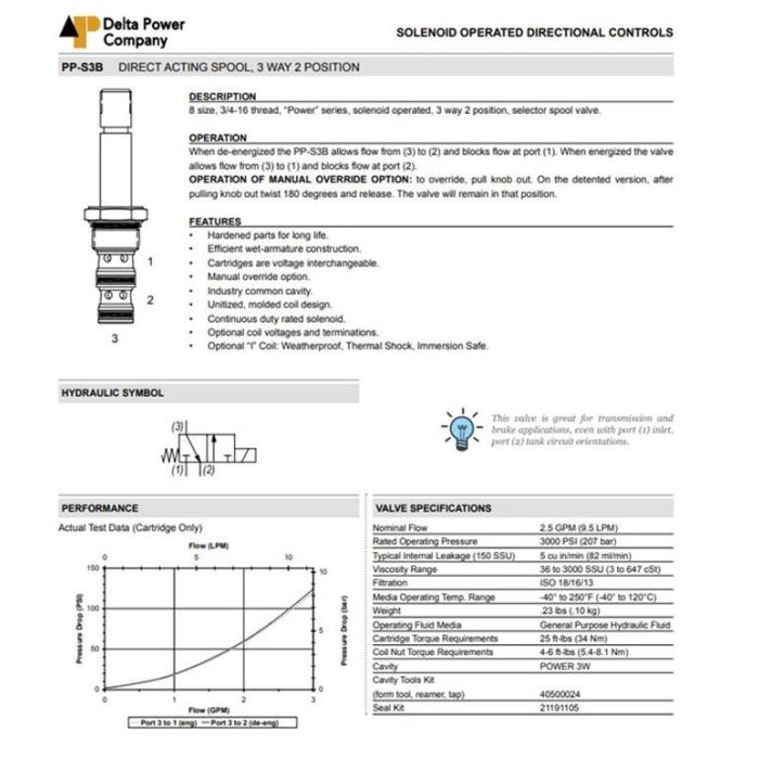PP-S3B-0M DELTA POWER, 3W2P SPOOL SELECTOR 3->2 - 3->1, POWER SERIES 8 SIZE, 3/4-16 THREAD, W/ BUNA SEALS, OVERRIDE & DETENT, PP S3B 0M, PPS3B0M