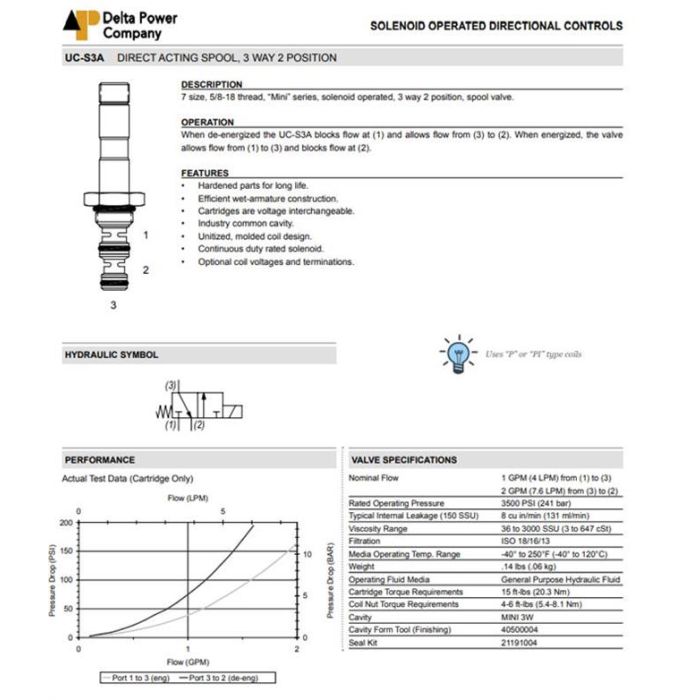UC-S3A-00 DELTA POWER, 3W2P SPOOL STANDARD 3->2 - 1->3, MINI SERIES 7 SIZE, 5/8-18 THREAD, W/ BUNA SEALS, UC S3A 00, UCS3A00