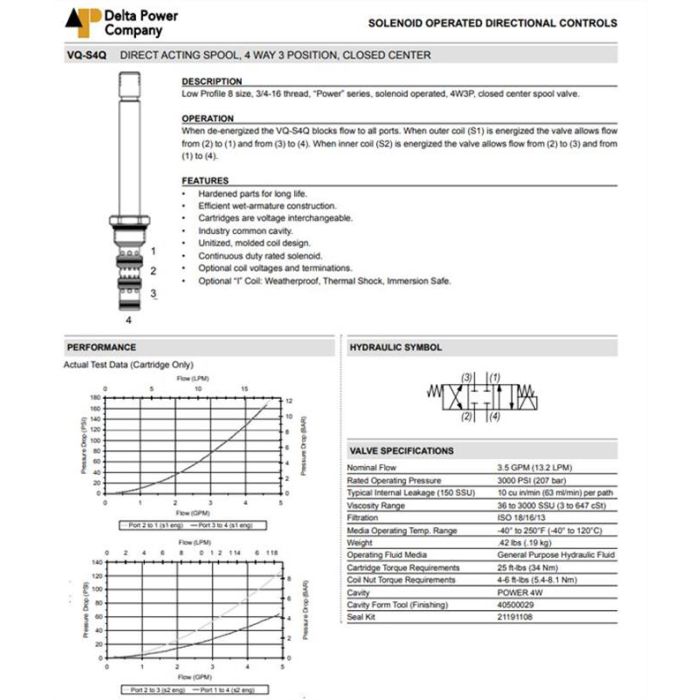 VQ-S4Q-V0 DELTA POWER, 4W3P SPOOL CLOSED CENTER, POWER SERIES 8 SIZE, 3/4-16 THREAD, W/ VITON SEALS, VQ S4Q V0, VQS4QV0