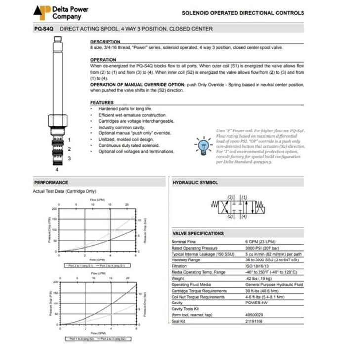 PQ-S4Q-0P DELTA POWER, 4W3P SPOOL CLOSED CENTER, POWER SERIES 8 SIZE, 3/4-16 THREAD, W/ BUNA SEALS & PUSH ONLY OVERRIDE, PQ S4Q 0P, PQS4Q0P