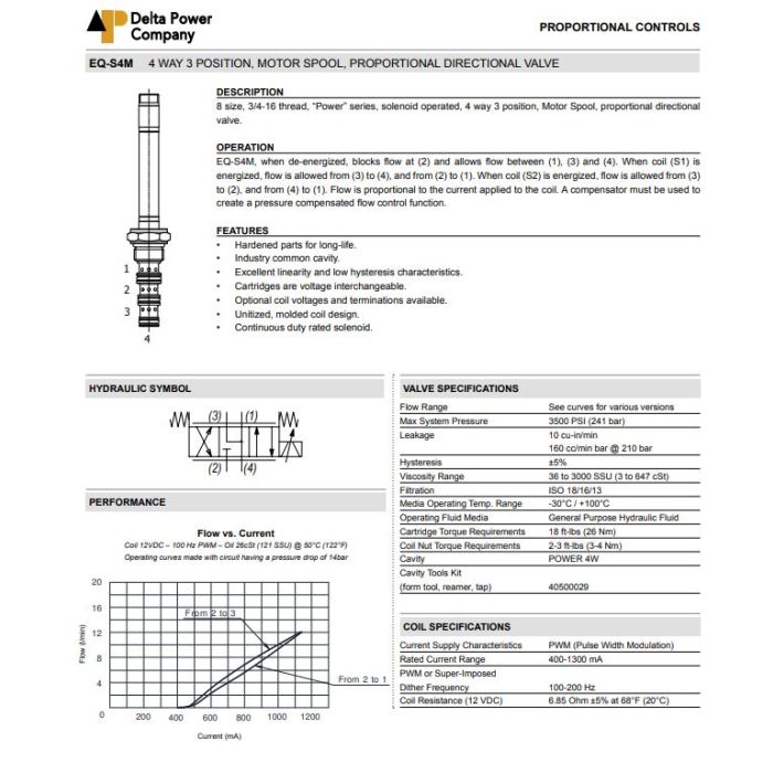 EQ-S4M-B0 DELTA POWER, 4 WAY 3 POSITION, MOTOR SPOOL, PROPORTIONAL DIRECTIONAL VALVE, 8 SIZE, POWER SERIES, 3/4-16 THREAD, PJ COIL TYPE, 4W3P MOTOR SPOOL, PROPORTIONAL DIRECTIONAL VALVE, W/ BUNA SEALS, PUSH TYPE OVERRIDE STANDARD UP TO 8 L/MIN, EQ S4M B0, EQS4MB0