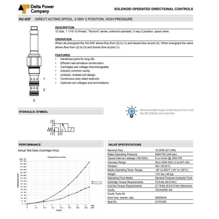 HU-S3F-00 DELTA POWER, HYDRAULIC VALVE, CARTRIDGE DIRECTION CONTROL THREE WAY, 1-1/16"-12 UNF THREAD, TECNORD SERIES, 3 WAY, TWO POSITION SPOOL VALVE UP TO 13.0 GPM, 5000 PSI, BUNA STANDARD. HU-S3F-00