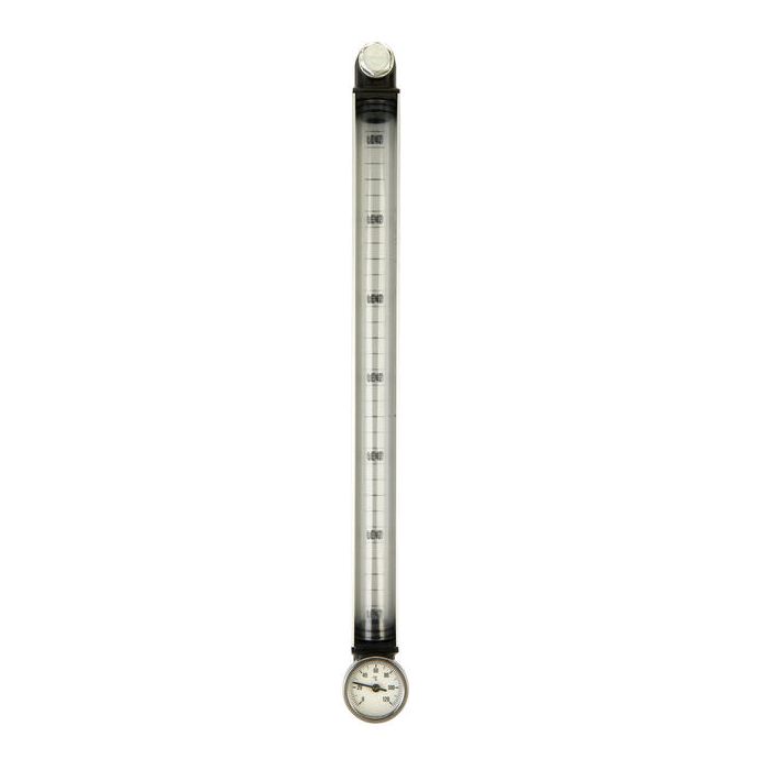 12" MOUNTING CENTER LEVEL-TEMP GAUGE, M12-STAINLESS STEEL MOUNTING HARDWARE, POLYCARBONITE TUBE, 90 DEGREE ROTATABLE ALUMINUM GUARD FOR SIDE VIEWING, DIAL THERMOMETER PROBE