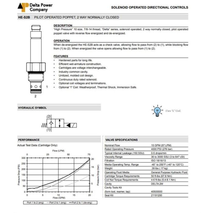 HE-S2B-00 DELTA POWER, 2W2P NORMALLY CLOSED PILOT OPERATED POPPET - REVERSE FLOW ENERGIZED, HIGH PRESSURE DELTA SERIES 10 SIZE, 7/8-14 THREAD, W/ BUNA SEALS, HE S2B 00, HES2B00