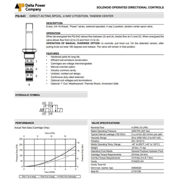 PQ-S4C-VM DELTA POWER, 4W2P SPOOL TANDEM CENTER, POWER SERIES 8 SIZE, 3/4-16 THREAD, W/ VITON SEALS, OVERRIDE & DETENT, PQ S4C VM, PQS4CVM