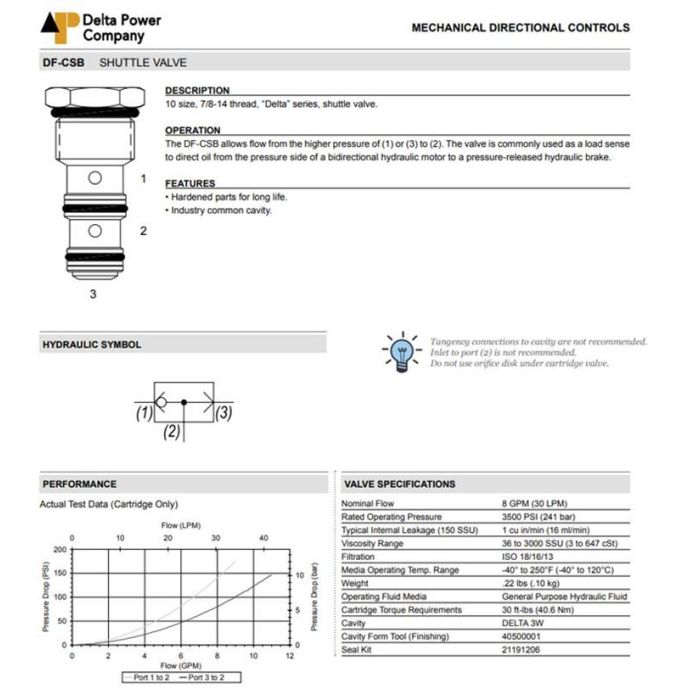 DF-CSB-V0 DELTA POWER, SHUTTLE VALVE, 10 SIZE, 7/8-14 THREAD, DELTA SERIES, W/ VITON SEALS, DF CSB V0, DFCSBV0
